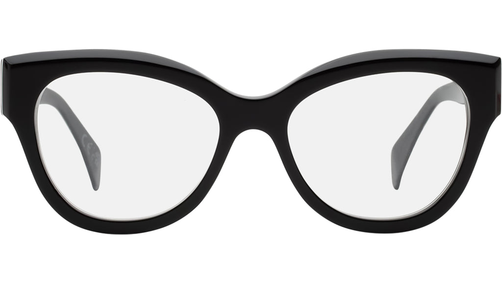 Numero 126 showcases a bold, oversized cat-eye design. The design features a distinct silhouette with rounded edges and sculpted rims, creating a playful and modern aesthetic for a versatile use. Available in a timeless shiny black acetate and clear lenses. Handcrafted in Italy. Sizes: Lens Width: 53 mm. Frame Front: 0 mm. Frame Side: 145 mm.