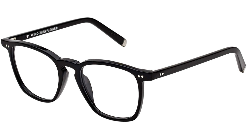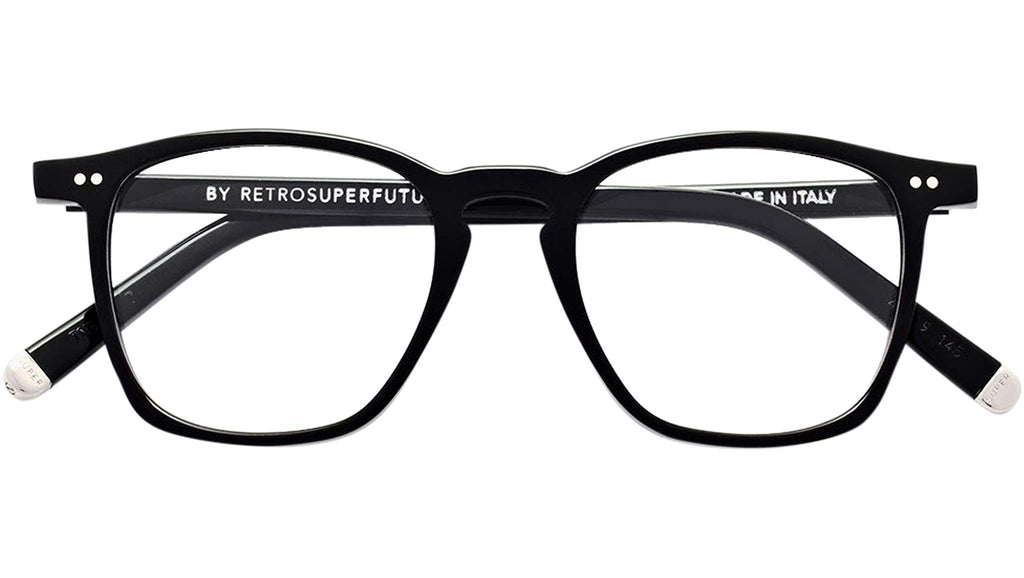 Numero 35 by Retrosuperfuture Nero is an essential, paired-down, silhouette with straight lines around the lenses, a bold keyhole nose-bridge, carefully molded rims and thick, square ends. This model features a light, airy black acetate. Prescription lenses not included.