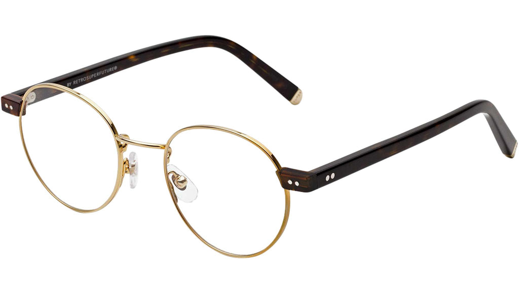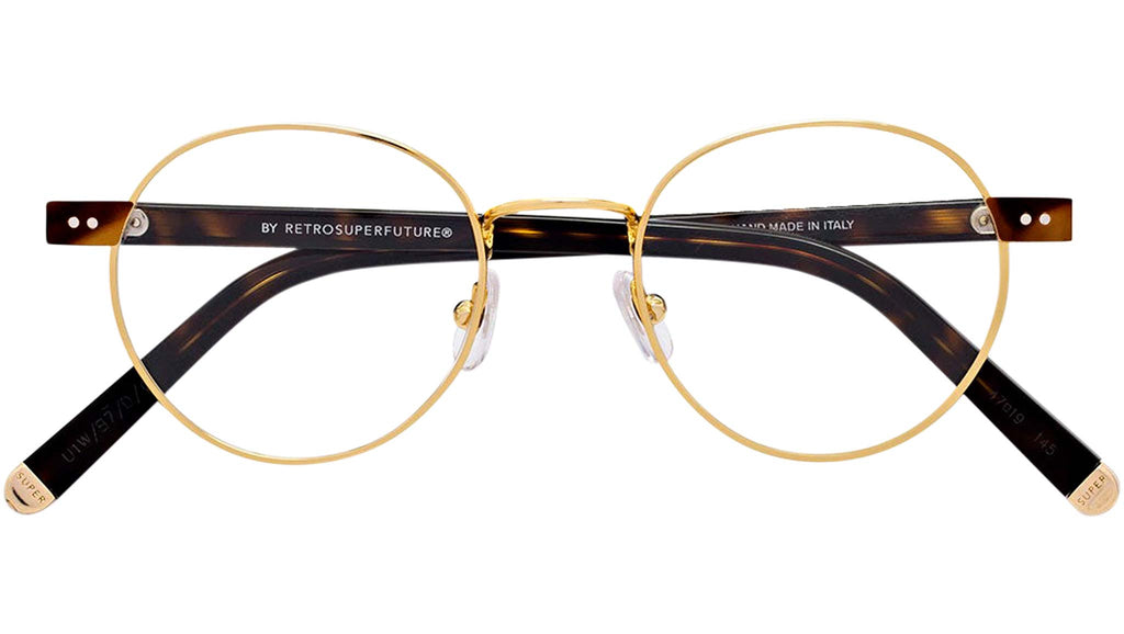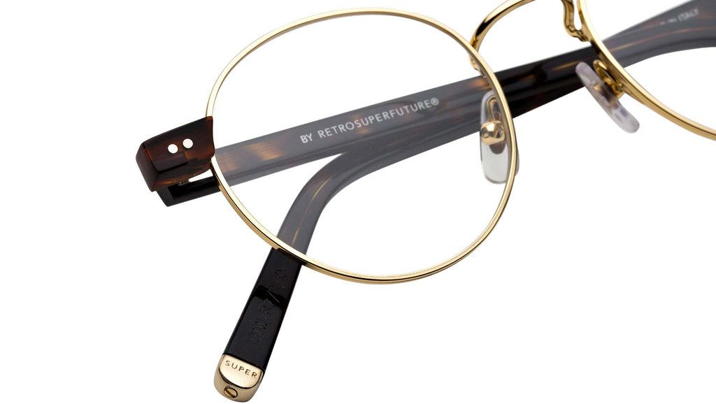 Numero 36 by Retrosuperfuture Oro is an essential oval frame characterized by its slim metal rims in contrast with the clean-cut acetate end-pieces and temples. This version of the frame features gold metal structure with warm Havana acetate. Prescription lenses not included. The box contains a hard case and a cleaning cloth.