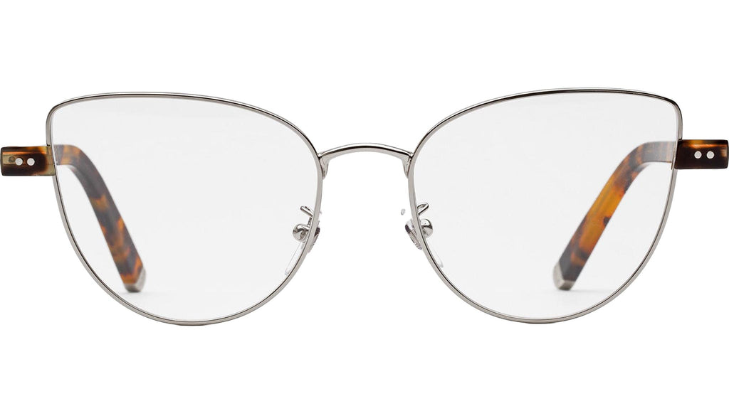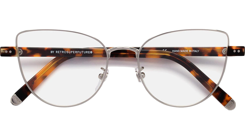 Numero 45 by Retrosuperfuture is a sophisticated feminine cat-eye silhouette. Characterised by a lightweight structure, the model features thin metal rims matched with comfortable acetate arms and prominent square endpieces. This version of the frame sports a shiny silver metal finish and dark spotted Havana acetate. Prescription lenses not included. The box contains a hard case and a cleaning cloth.
