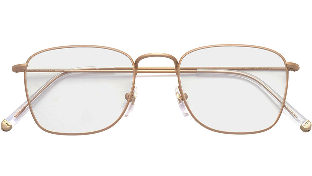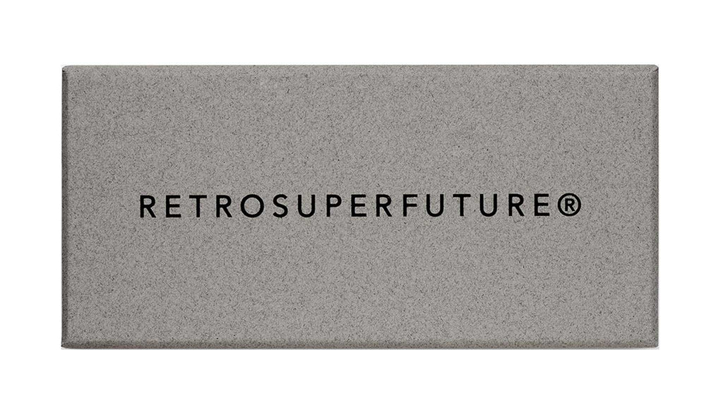 Numero 50 by Retrosuperfuture is a minimal and light all-metal model. The silhouette draws from 1990s essential designs, with its rectangular shape, wire structure and a pared-down aesthetics. This version of Numero 50 features a matte white gold metal finish with crystal acetate on the temple tips. Prescription lenses not included. The box contains a hard case and a cleaning cloth.