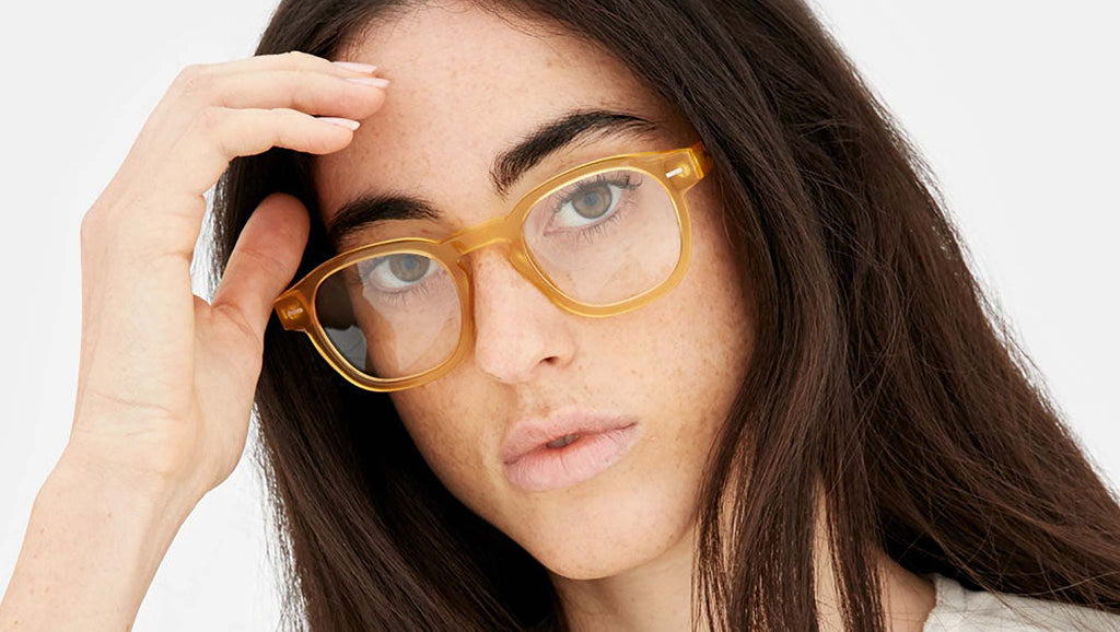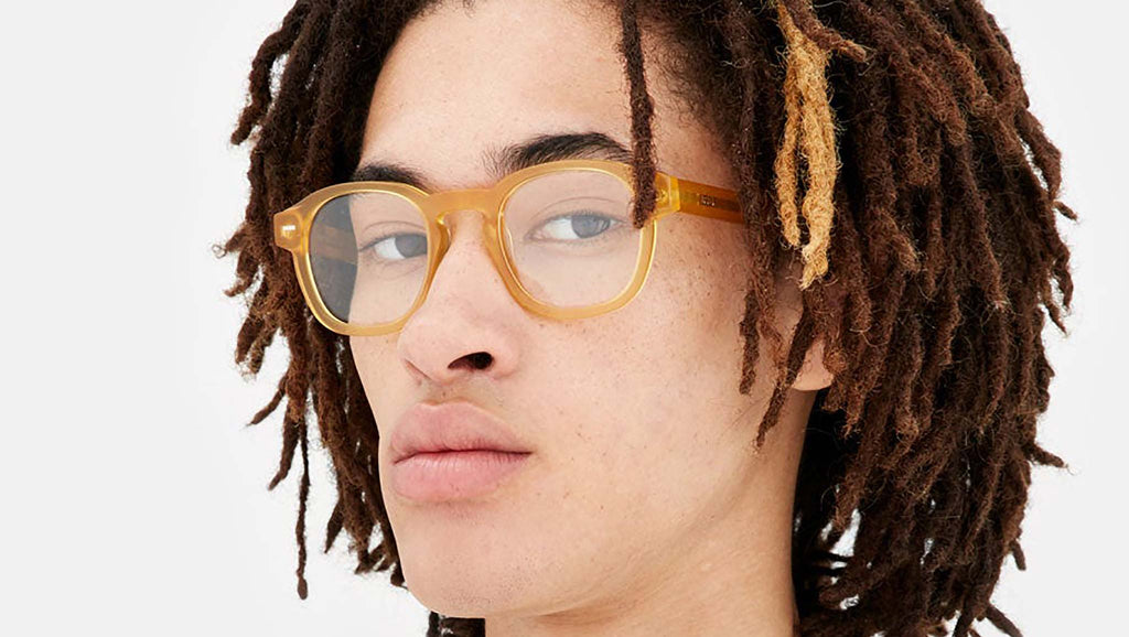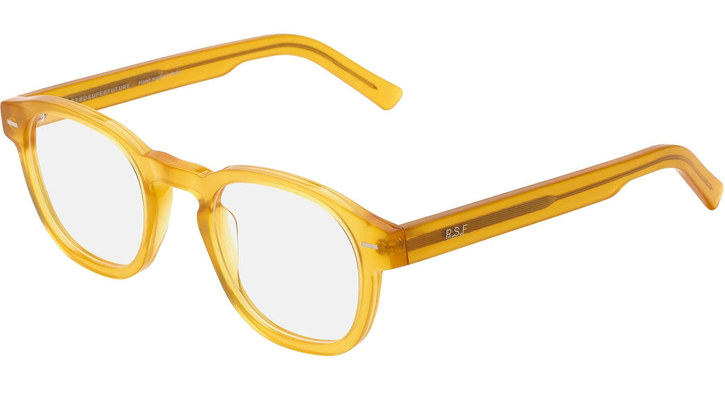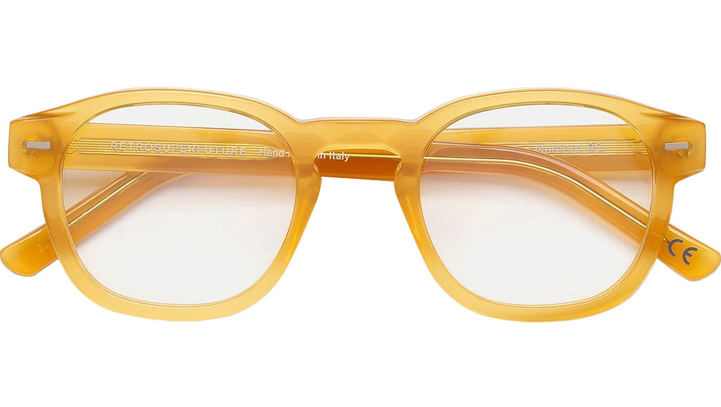 Numero 80 by Retrosuperfuture updates vintage references for contemporary style. Conceived as a functional everyday frame, it has thick acetate rims, with rounded rectangular lenses and protruding temples moulded for a perfect fit. This version comes in a honey-tinted crystal acetate. Prescription lenses not included. The box contains a hard case and a cleaning cloth. Sizes: R Lens Width: 50 mm. Frame Front: 146 mm. Frame Side: 145 mm. Product Code Size R: GLO