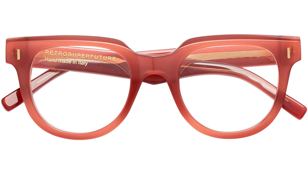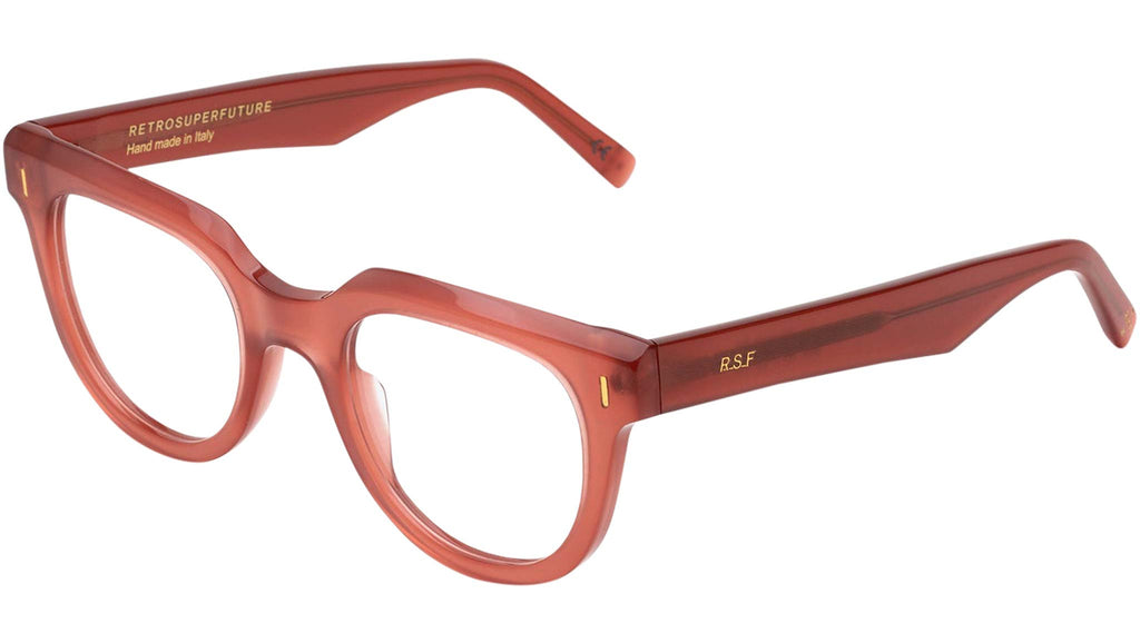 Numero 82 by Retrosuperfuture is a contemporary silhouette inspired by iconic vintage references. The model features an angular brow-line, with rounded rims encasing its generous lenses for a perfect fit. This version features a sophisticated light red crystal acetate. Prescription lenses not included. The box contains a hard case and a cleaning cloth. Sizes: R Lens Width: 49 mm. Frame Front: 146 mm. Frame Side: 145 mm. Product Code Size R: 3LE
