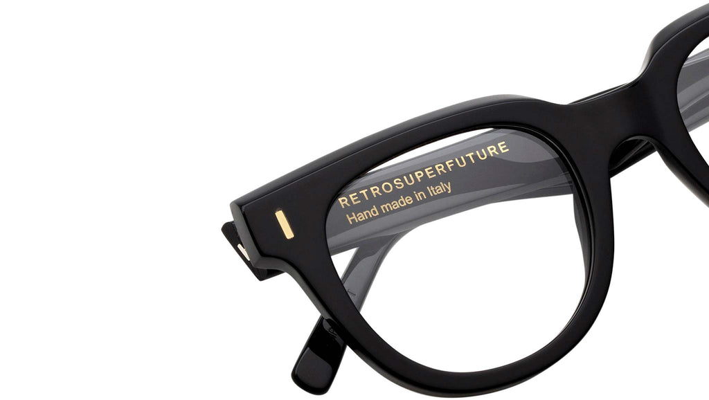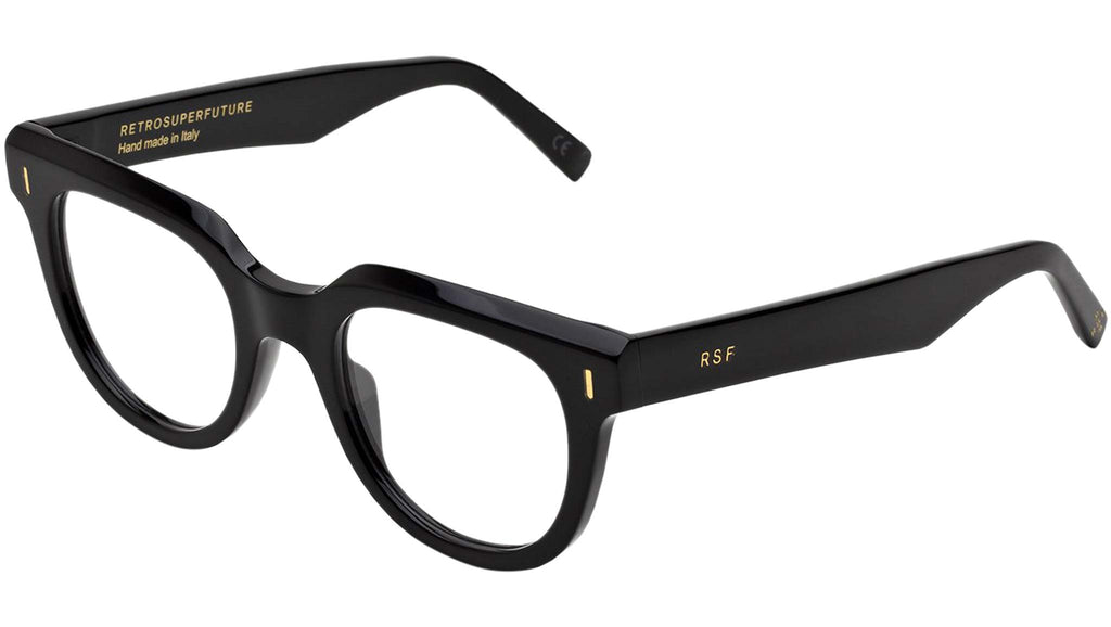 Numero 82 by Retrosuperfuture is a contemporary silhouette inspired by iconic vintage references. The model features an angular brow-line, with rounded rims encasing its generous lenses for a perfect fit. This version comes in a shiny black acetate. Prescription lenses not included. The box contains a hard case and a cleaning cloth.