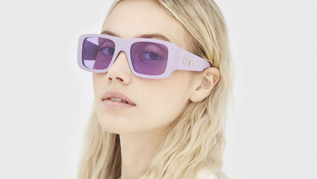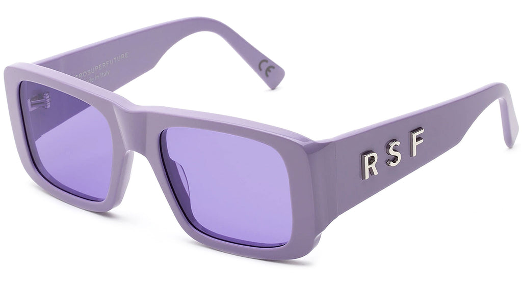 A key RSF statement piece, Onorato is a model inspired by 1970s references, from Aristotle Onassis to Miles Davis. A bold acetate frame with a sturdy, oversized design, Onorato features a straight upper line and a bold nose-bridge. Thick acetate rims curve around the temples match its distinctive wide temple tips. Oversized and with a street edge, this version comes with a lilac acetate and matching purple tinted lenses.