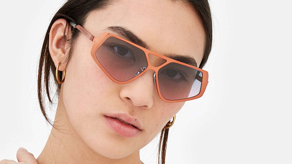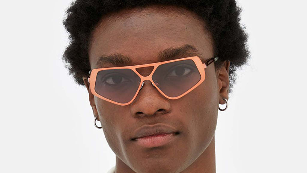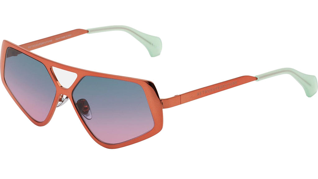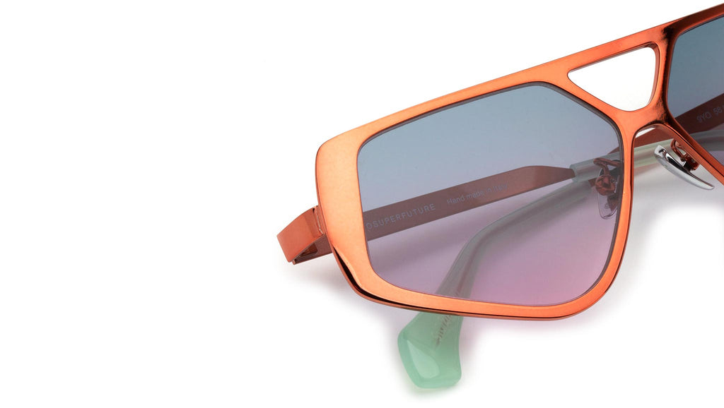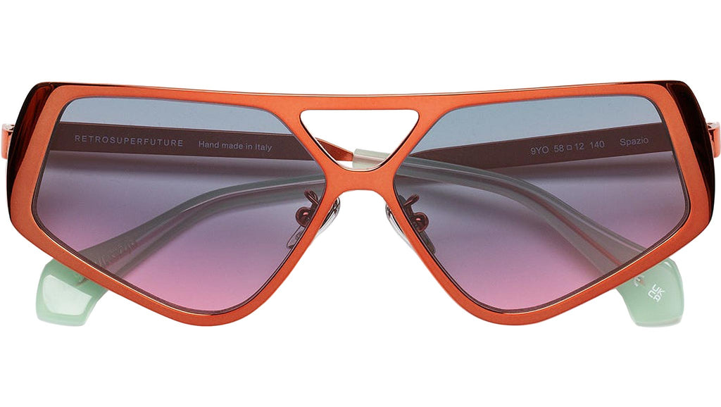 Spazio is a forward-looking shape whose retrosuperfuturistic design offers a fresh interpretation of metal eyewear construction. Its thick rims have been cast in a pentagonal shape with a double nose-bridge for a study and innovative silhouette. This is an uncompromising piece that elevates classic metal aviator shapes to new aesthetic levels. This version comes in a bold orange chromed finish with purple fading lenses. The box contains a semi-hard case and a cleaning cloth. Sizes: R Lens Width: 58 mm. Frame Front: Frame Side: 140 mm. Product Code Size R: 9YO