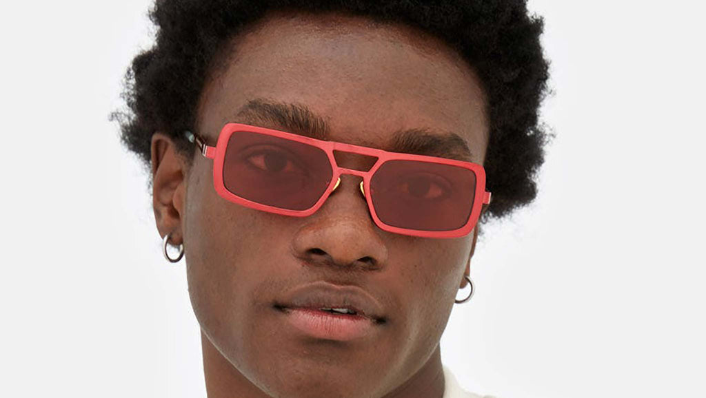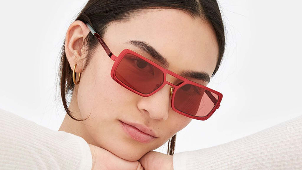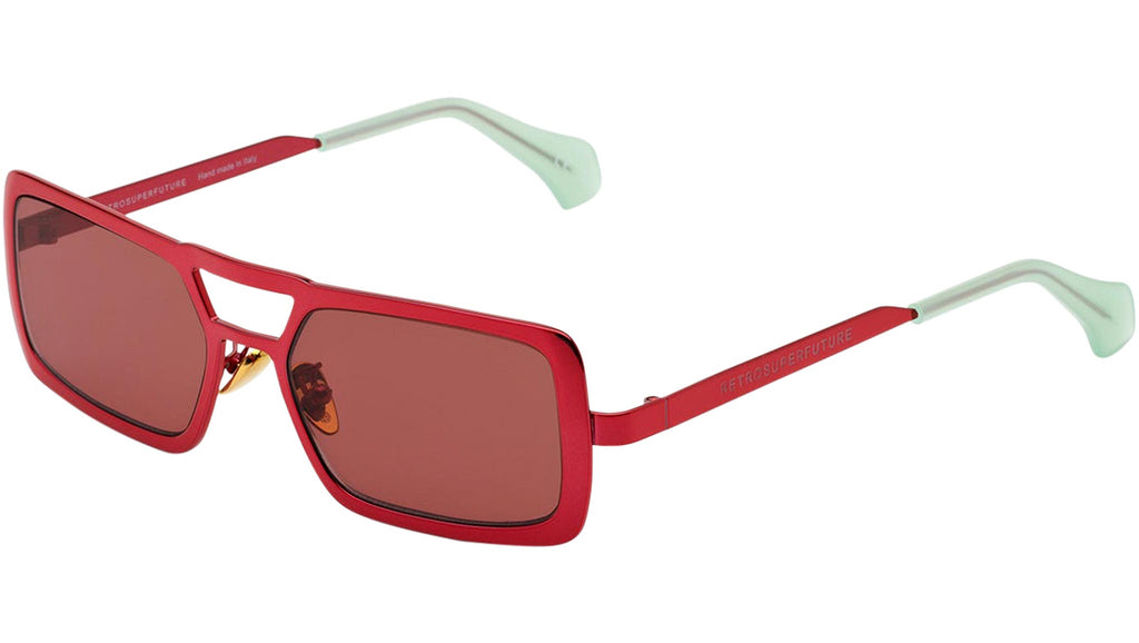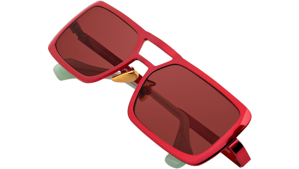 Stereo works on elevating the concept of metal designs with its unique design, structure and sophisticated finishes. The model is conceived as a retrosuperfuturistic interpretation of timeless metal sunglasses, with its prominent double nose-bridge and thick rims. Its wide, oversized geometries are highlighted by fresh and playful chromed finishes: a bright red metallic finish with Bordeaux lenses and topped off with soft mint green temple tips. Sizes: R Lens Width: 56 mm Frame Front: Frame Side: 140 mm Product Code Size R: MM4