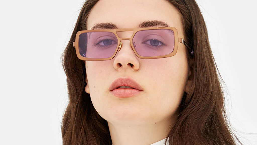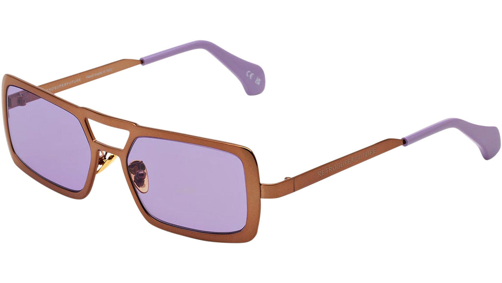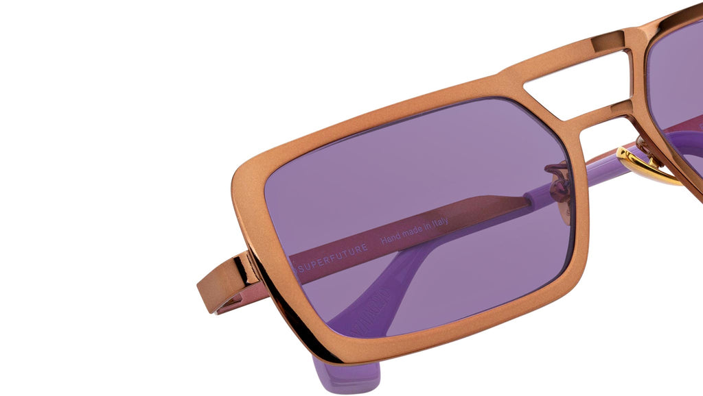Stereo works on elevating the concept of metal designs with its unique design, structure and sophisticated finishes. The model is conceived as a retrosuperfuturistic interpretation of timeless metal sunglasses, with its prominent double nose-bridge and thick rims. Its wide, oversized geometries are highlighted by fresh and playful chromed finishes: a shiny bronze polish is matched with hazy purple lenses and lilac temple tips. Sizes: R Lens Width: 56 mm Frame Front: Frame Side: 140 mm Product Code Size R: FVZ