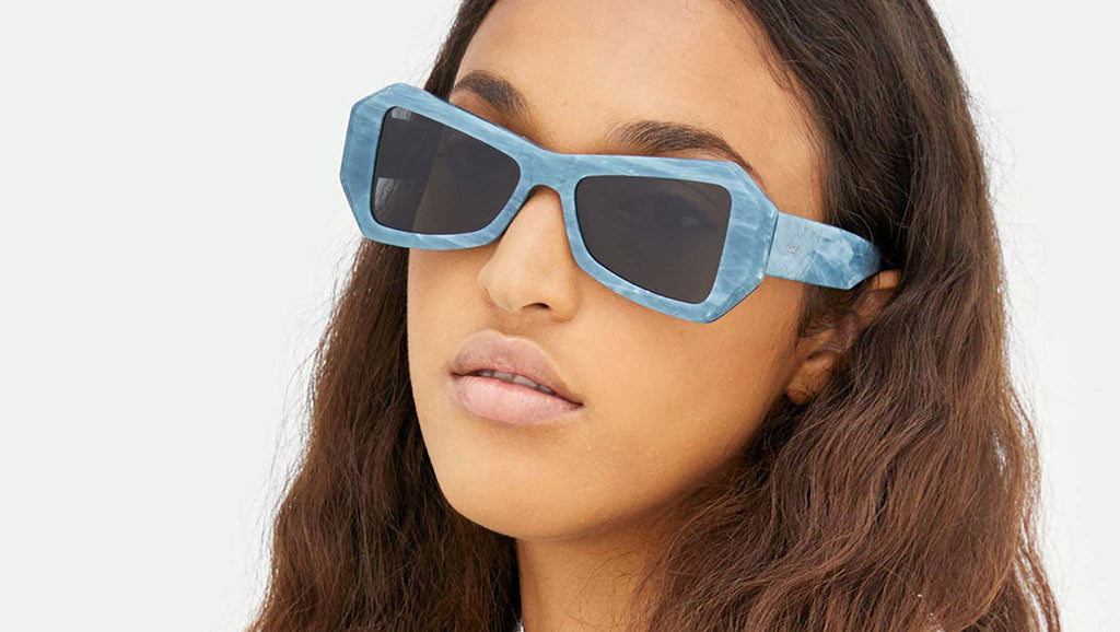 Known for their experimental approach to design, RSF have crafted a Tempio, a silhouette that is both fresh yet wearable. Templo blends street references with high-end fashion appeal. Characterised by sharp lines, the model features thick acetate rims that have been sculpted to form a V-shaped browline and oversized lenses. This futuristic-looking shape is a head-turning piece of eyewear. Tempio comes in a unique blue marbled acetate with smoky grey lenses. Sizes: R Lens Width: 53 mm. Frame Front: Frame Side: 145 mm. Product Code Size R: BJR