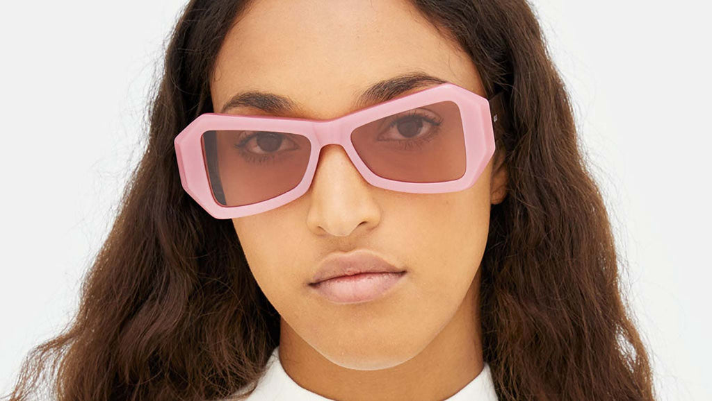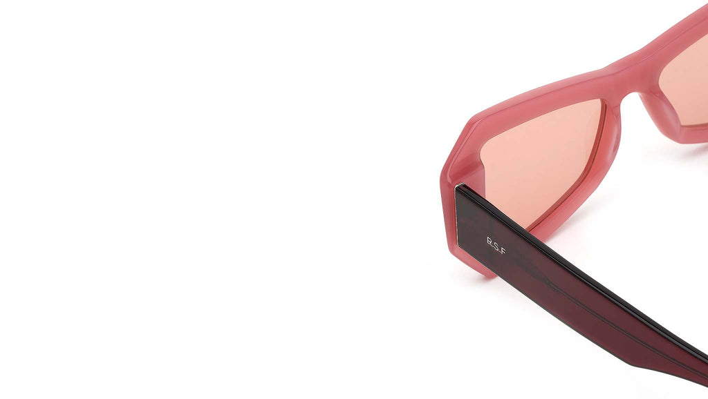 Known for their experimental approach to design, RSF have crafted a Tempio, a silhouette that is both fresh yet wearable. Templo blends street references with high-end fashion appeal. Characterised by sharp lines, the model features thick acetate rims that have been sculpted to form a V-shaped browline and oversized lenses. This futuristic-looking shape is a head-turning piece of eyewear. Tempio comes in with a candy-colored pink front, burgundy temples and pink tinted lens. Sizes: R Lens Width: 53 mm. Frame Front: Frame Side: 145 mm. Product Code Size R: 8BU