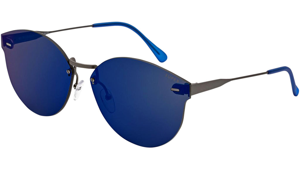 Retrosuperfuture Tuttolente Panamá Blue is the latest addition to the groundbreaking all-lens series of eyewear. Carefully moulding the silhouette, the brand’s designers have eliminated the acetate structure joining the lenses directly onto the metallic nose-bridge and temples. The model is made of ZEISS lens in blue mirror. The box contains a semi-hard case and a cleaning cloth.