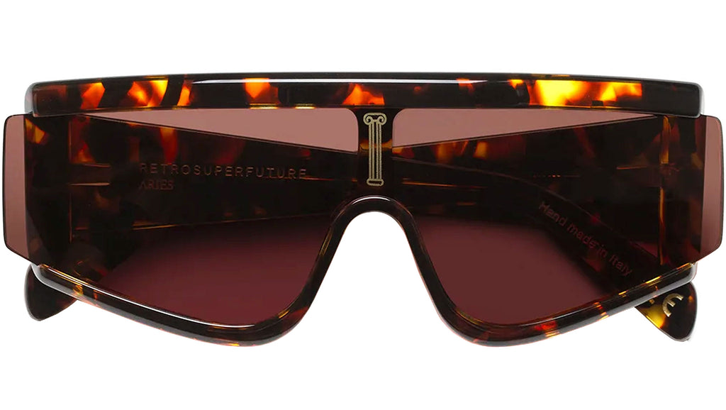 The final touch was given by Aries, who customized the piece with its signature broken Roman column, creating two gold metal decors for the temples and a central graphic on the frame’s prominent shield. This version comes in a medium tortoise havana acetate paired with a tinted brown lens.