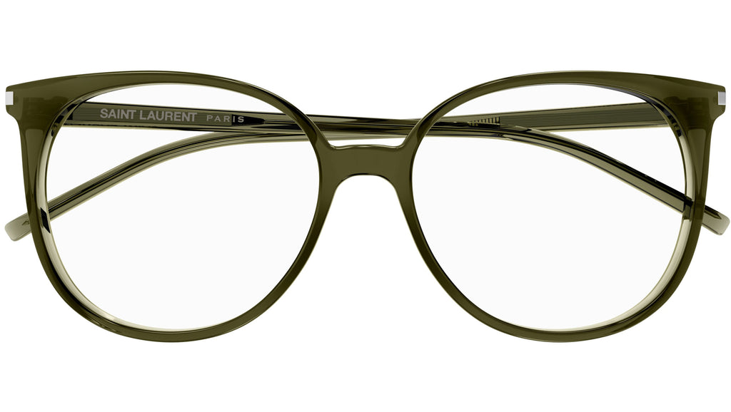 Occhiali da vista Saint Laurent modello SL 39 linea Classic codice colore 006 verde trasparente lucido in acetato forma panthos con aste color verde.
