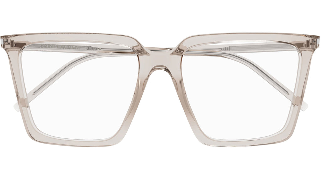 Occhiali da vista Saint Laurent modello SL 474 OPT linea Classic codice colore 003 rosa trasparente lucido in acetato riciclato forma butterfly con aste color beige nude.