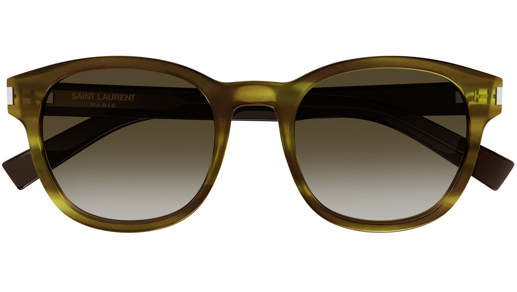 Occhiali da sole Saint Laurent modello SL 620 linea Classic codice colore 005 kaki melange avana in acetato riciclato forma panthos con lenti color marrone sfumato.