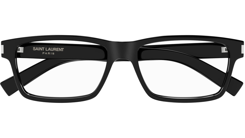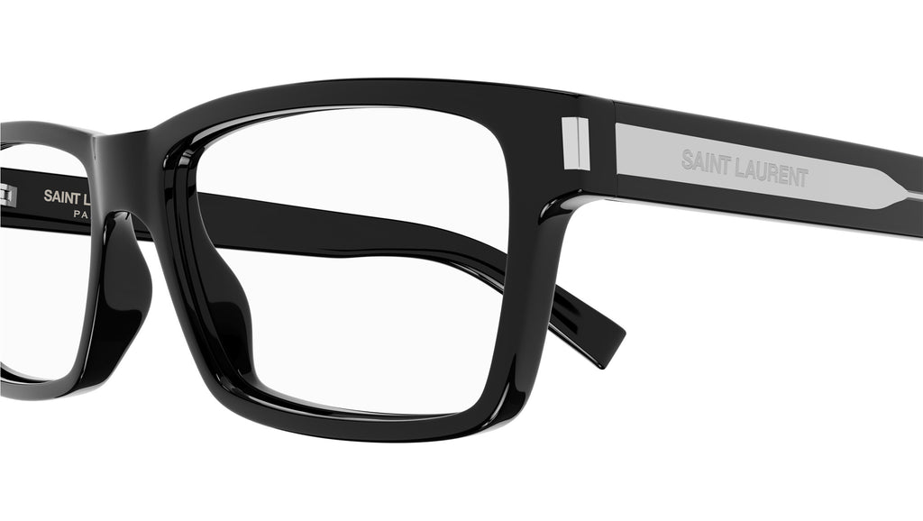 Occhiali da vista Saint Laurent modello SL 622 linea Classic codice colore 001 nero lucido tinta unita in acetato riciclato forma rectangle con aste color cristallo trasparente.