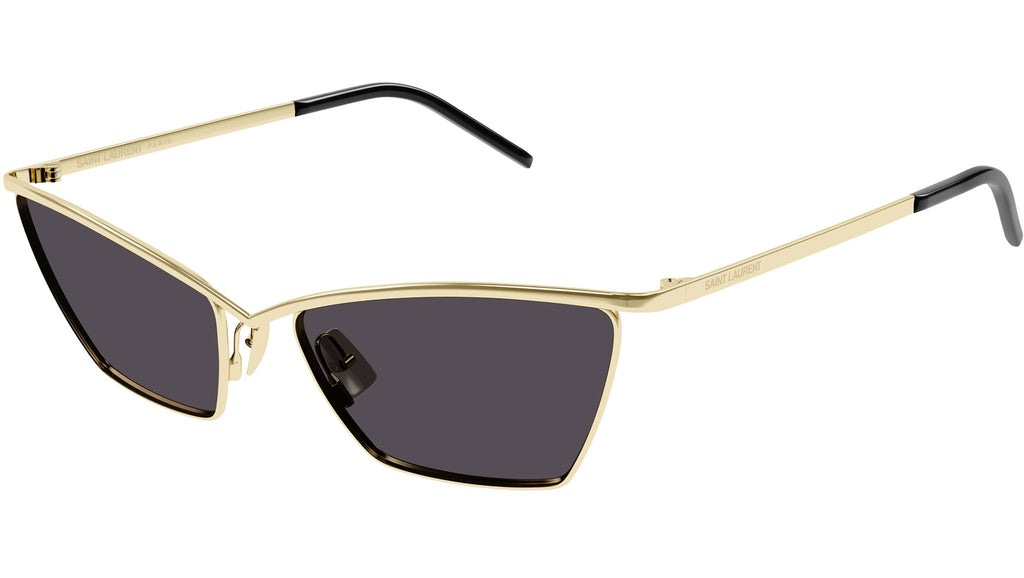 Occhiali da sole Saint Laurent modello SL 637 linea New Wave codice colore 003 oro chiaro lucido in metallo forma cat eye con lenti color nero tinta unita.