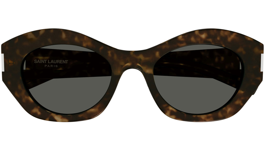 Occhiali da sole Saint Laurent modello SL 639 linea New Wave codice colore 002 tartaruga scuro lucido in acetato riciclato forma cat eye con lenti color grigio tinta unita.