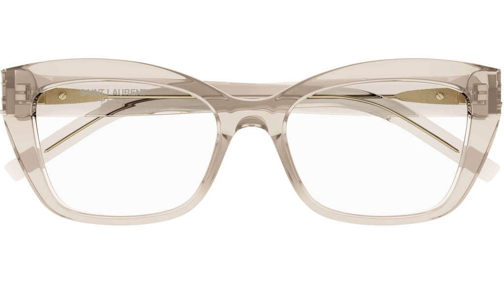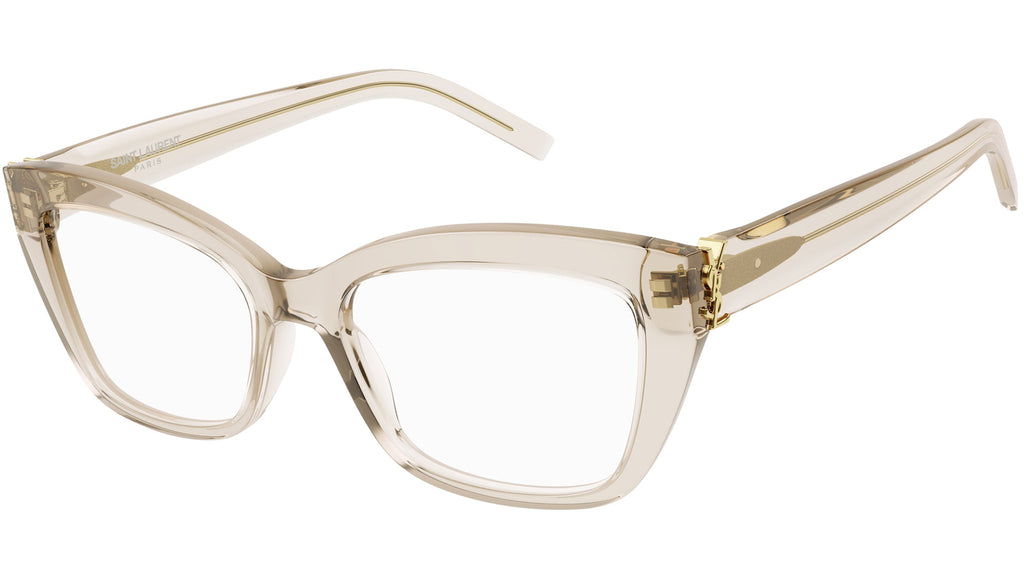 Occhiali da vista Saint Laurent linea Monogram modello SL M117 variante colore 004 nude trasparente lucido con astine color beige nude.