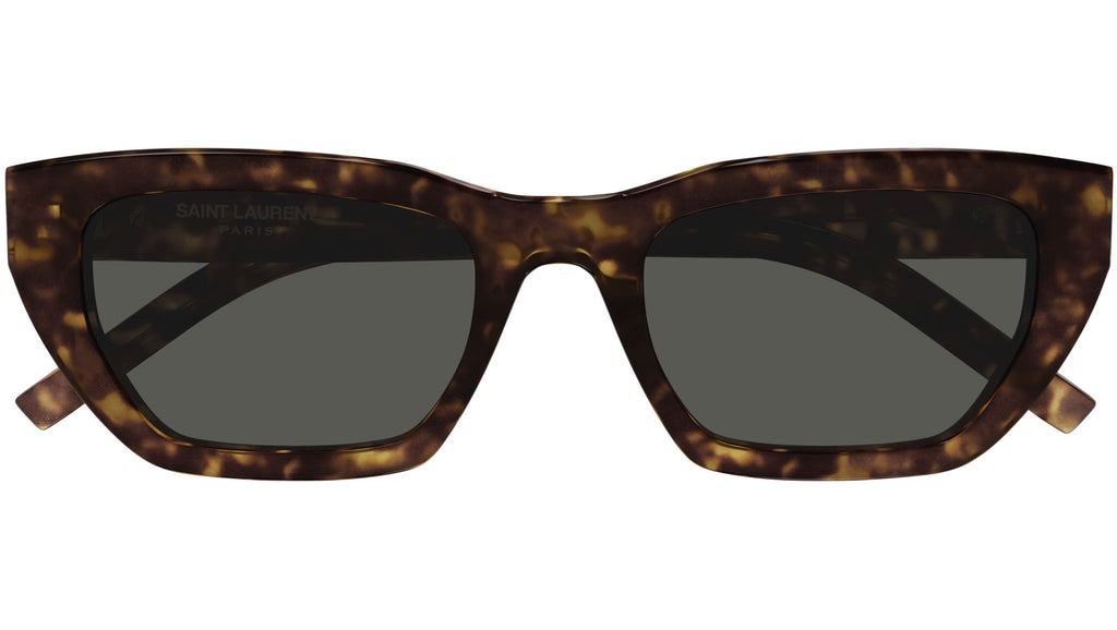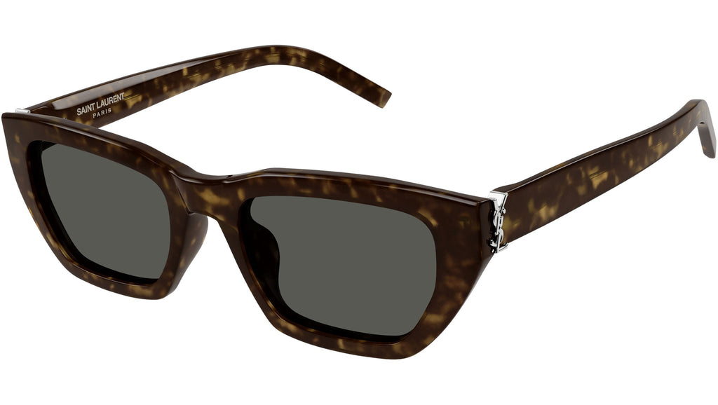 Occhiali da sole Saint Laurent modello SL M127/F linea Monogram codice colore 002 tartaruga scuro lucido in acetato riciclato forma cat eye con lenti color grigio tinta unita.