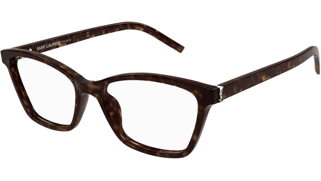 Occhiali da vista Saint Laurent modello SL M128 linea Monogram codice colore 002 tartaruga scuro lucido in acetato riciclato forma cat eye con aste color tartaruga.