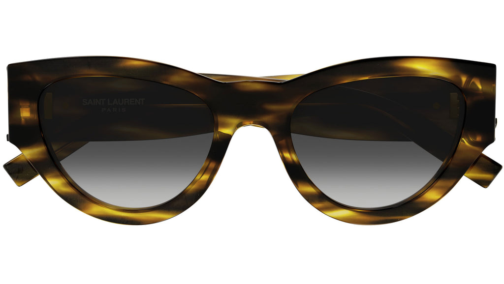 Occhiali da sole Saint Laurent modello SL M94 linea Monogram codice colore 005 avana fiammato lucido in acetato forma cat eye con lenti color grigio sfumato.