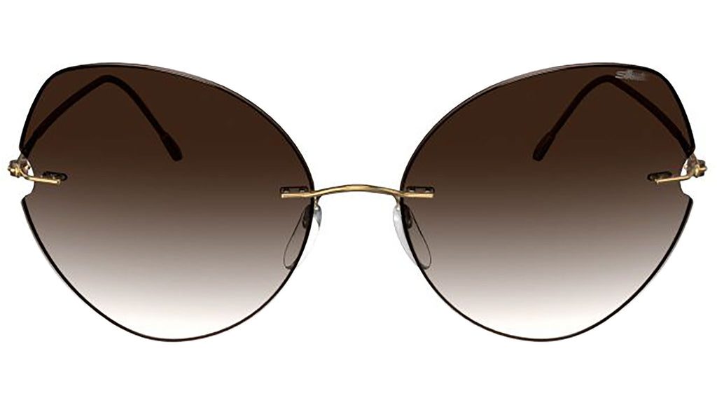 Silhouette Rimless Shades 8182 in 7530 frame color featuring classic brown gradient lenses. The Rimless Shades Collection fuses the simplicity of ultra-thin titanium and the dynamism of oversized lenses highlighted by bold colors. Its sensual curves and lens-to-temple cut-outs deliver a sense of luxury and femininity. The Fisher Island model, with its distinctive butterfly shape, represents modern chic at its most subtly refined. These glasses prioritize comfort and lightness, maintaining a screwless, hypoallergenic design, with a base 6 curvature, and have been recognized with a design award. The high-impact polycarbonate lenses, which can be adapted to prescription needs after retailer consultation, provide comprehensive UV A, B, and C protection, equivalent to UV 400, and have an anti-reflective coating on the backside. In a testament to the brand's precision and craftsmanship, Silhouette's frames and lenses work in perfect synergy, ensuring an optimal visual experience. This handcrafted quality, intrinsic to Silhouette Vision Sensation®, is entirely realized in Austria and extends to their sunglasses range.
