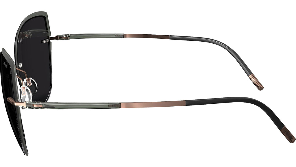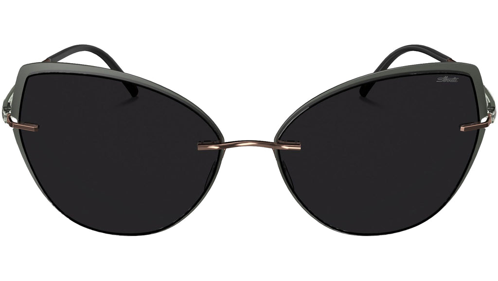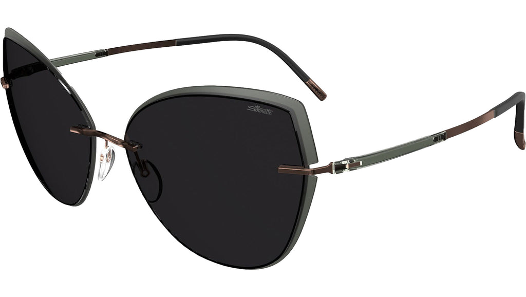 Silhouette Accent Shades 8188 in 6630 frame color featuring dark grey lenses. Accentuated with Accent Rings to highlight the lens shape, the Ribera cat-eye sunglasses create a bold and alluring appearance with soft, angular lines. The dramatic contour is reminiscent of an elegant brushstroke that begins subtly, broadens, and then delicately tapers off. These glasses deliver superior wearing comfort and are constructed without screws. They're hypoallergenic and feature a base 6 curvature. The lenses, made from high-impact polycarbonate, come with the Silhouette Light Management® feature, provide complete protection from UV A, B, and C rays, equivalent to UV 400, and have an anti-reflective coating on the backside. Silhouette aims for a harmonious blend of frames and lenses to guarantee an optimal visual experience, as lenses are custom-made to fit their respective frames. The Vision Sensation® lenses by Silhouette, crafted predominantly by hand and with the utmost precision, are 100% made in Austria. Moreover, the benefits of Silhouette's Vision Sensation® technology are now incorporated into their sunglasses.