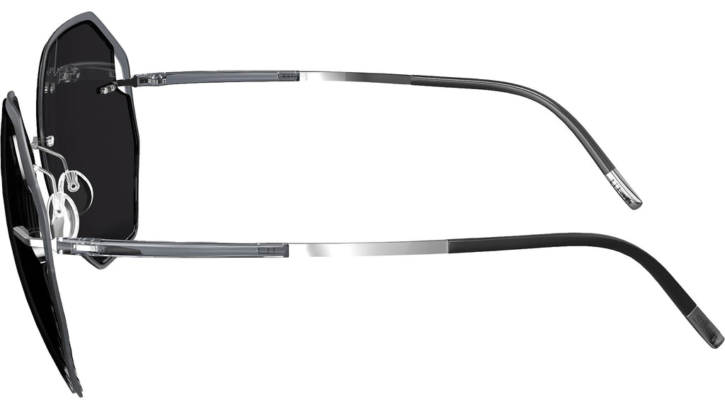 Silhouette Accent Shades 8187 in 6500 frame color featuring dark grey lenses. The Sant Martí showcases a contemporary octagonal lens shape, emphasized by Accent Rings that wrap around the lens to highlight its unique design. Clever side cut-outs provide optimal comfort and support by allowing precise positioning of the temples. These glasses offer superior comfort, are hypoallergenic, and crafted without screws, with a base 6 curvature. Their lenses feature Silhouette's innovative Light Management® technology, an anti-reflective coating on the backside, and high-impact polycarbonate construction, providing full UV A, B, and C protection, equivalent to UV 400. The Silhouette Light Management® technology ensures 100% UV protection, significant anti-glare protection, and enhanced colors. These glasses come in traditional sunglasses colors: grey, brown, and green.